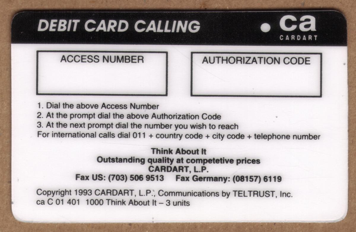 This card is associated with L P Communications and is part of the 1993 3u CardArt Promotional series, featuring artwork titled "Think About It." It is a specimen card issued by Teltrust, Inc., linked to the company WorldCom. The minimalistic artwork and branding create a memorable collectible piece connected to early 1990s telecommunications promotional materials.