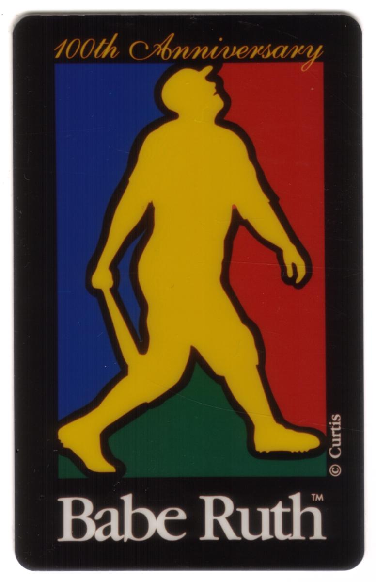 This collectible card celebrates the 100th anniversary of Babe Ruth, one of baseball’s most iconic figures. The card features a vibrant, stylized silhouette of Babe Ruth in yellow, holding a bat and walking with a confident stride. The background is divided into three vertical sections with blue on the left, red on the right, and a green triangular ground area beneath the figure.