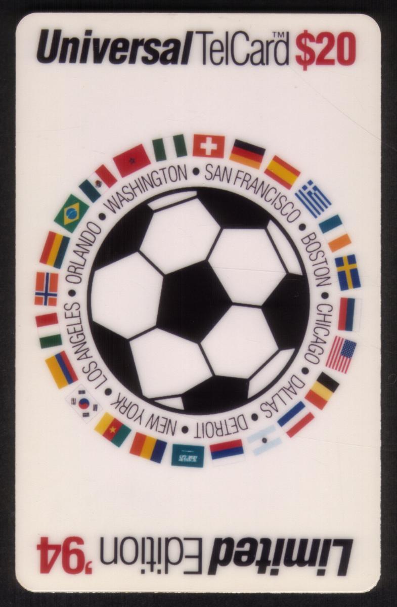Limited edition 1994 FIFA World Cup soccer-themed prepaid phone card featuring flags, major U.S. cities, and a $20 value for international calls. |