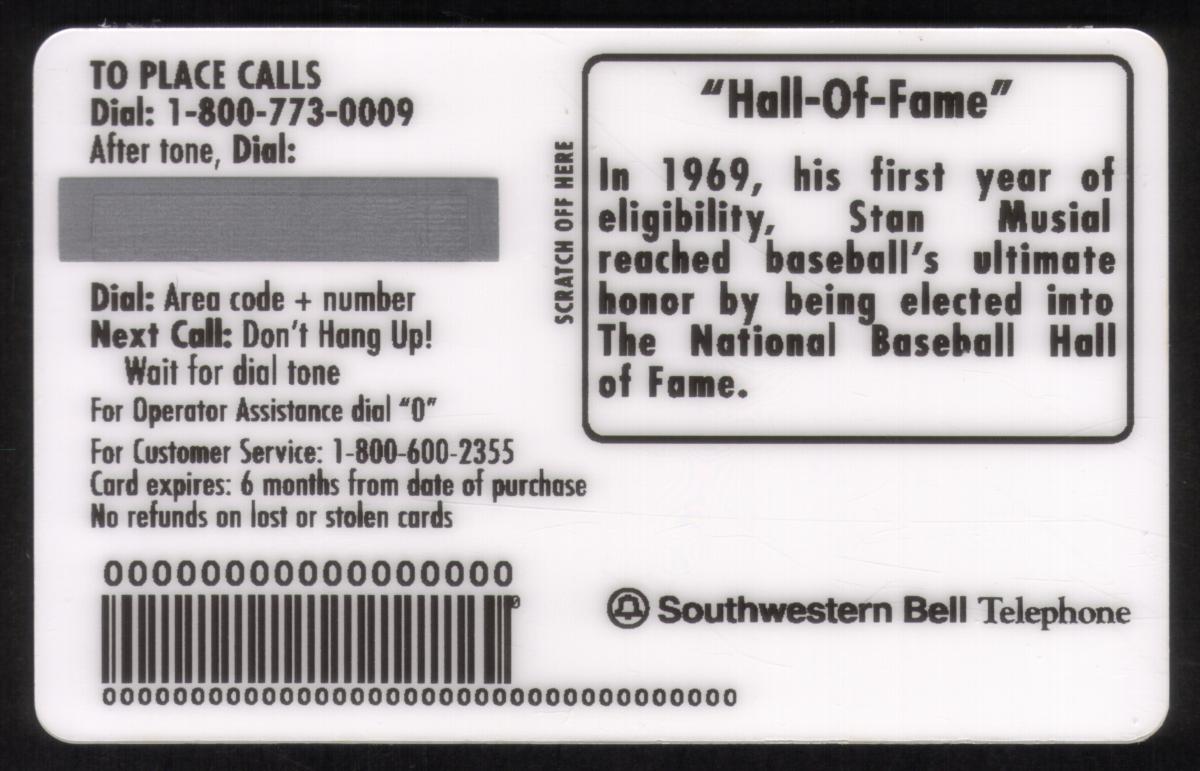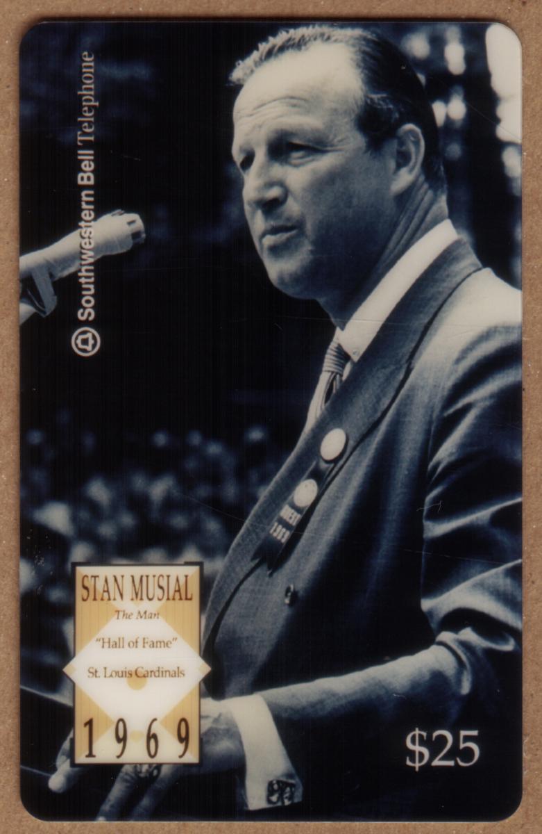 This collectible phone card features a black-and-white portrait of Stan Musial, a legendary baseball player for the St. Louis Cardinals. Musial is shown wearing a suit and tie, standing at a microphone, with a focused expression. The card includes the Southwestern Bell Telephone logo and name vertically along the left edge.