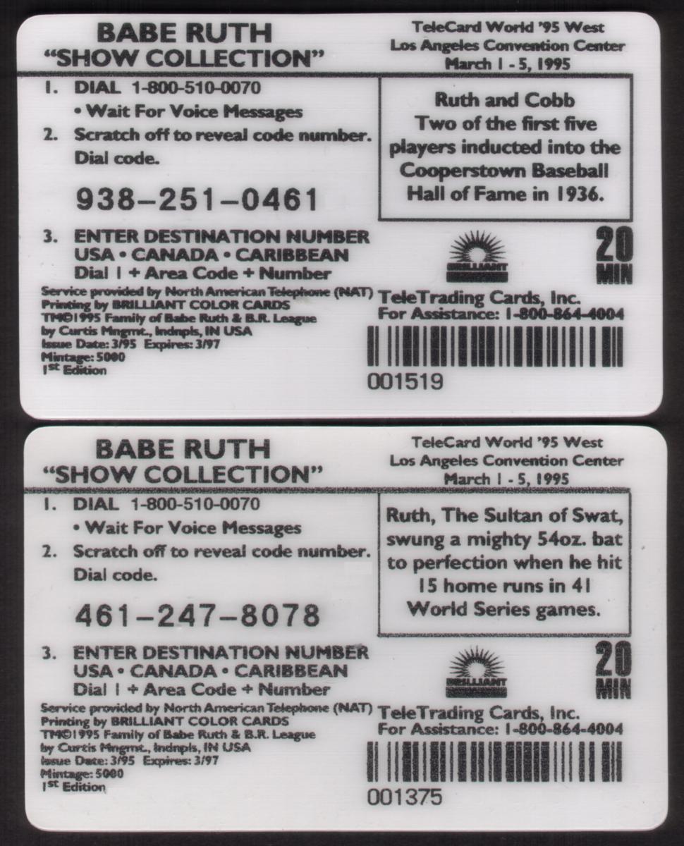 This set features two TeleTrading collectible phone cards from the Babe Ruth "Show Collection," each with a 20-minute usage time. The first card depicts a black and white photograph of two legendary baseball players standing side by side: Babe Ruth in his New York Yankees uniform and Ty Cobb in his Detroit Tigers uniform. Both players’ names are handwritten in white script just above the printed title, “Babe Ruth - Show Collection,” positioned near the bottom of the card.