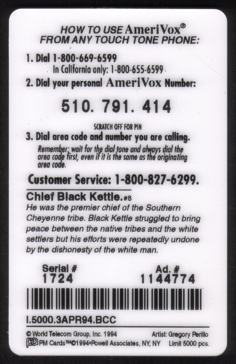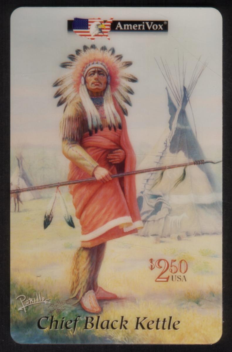 This collectible phone card features artwork of Chief Black Kettle, a notable figure from Native American history. The detailed illustration by Perillo portrays Chief Black Kettle wearing a traditional headdress with feathers and dressed in a red garment with fringed sleeves. He is holding a long spear or staff horizontally across his body.