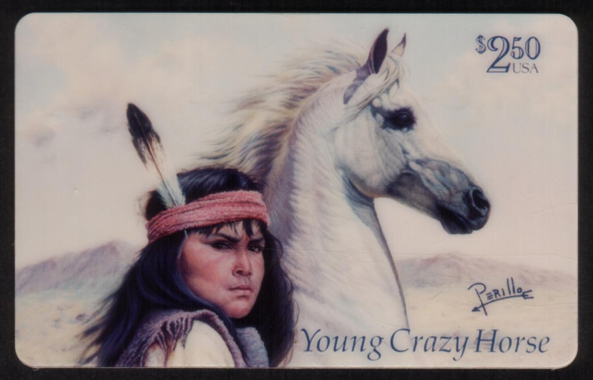 This collectible chip card features artwork titled "Young Crazy Horse" by Perillo, portraying a young Native American man alongside a white horse. The man is depicted with long dark hair and wears a headband adorned with two feathers. He has a serious and focused expression, reflecting strength and determination. The detailed artwork highlights cultural elements of American Indians, connecting to themes of Americana and American history.