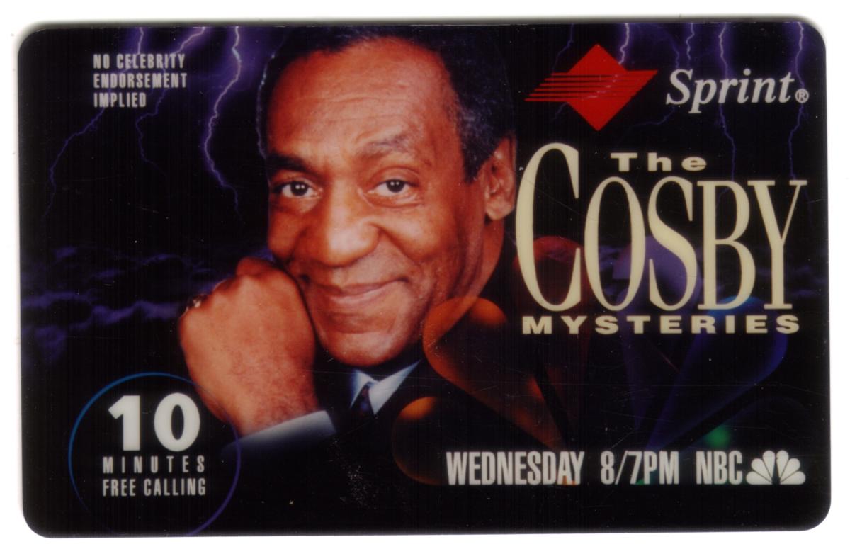 This collectible phone card features Bill Cosby prominently on the front with a confident, smiling portrait set against a dark background with subtle lightning effects. The card is branded with the Sprint logo in red and white at the top right corner. Below Bill Cosby's image, the title "The Cosby Mysteries" is displayed in large, stylized text, emphasizing the association with the television show.