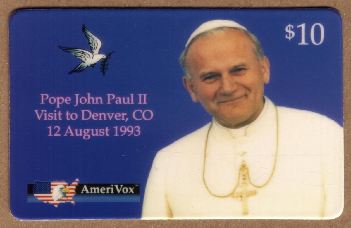In the top right corner, the card displays a white denomination of "$10." To the left of Pope John Paul II’s image, there is a white dove carrying an olive branch, symbolizing peace. Below the dove, the text reads: "Pope John Paul II Visit to Denver, CO 12 August 1993" in a formal serif font, also in white. The bottom left corner includes a small logo of an American flag blending into a map of the United States with the text "AmeriVox" in white letters.