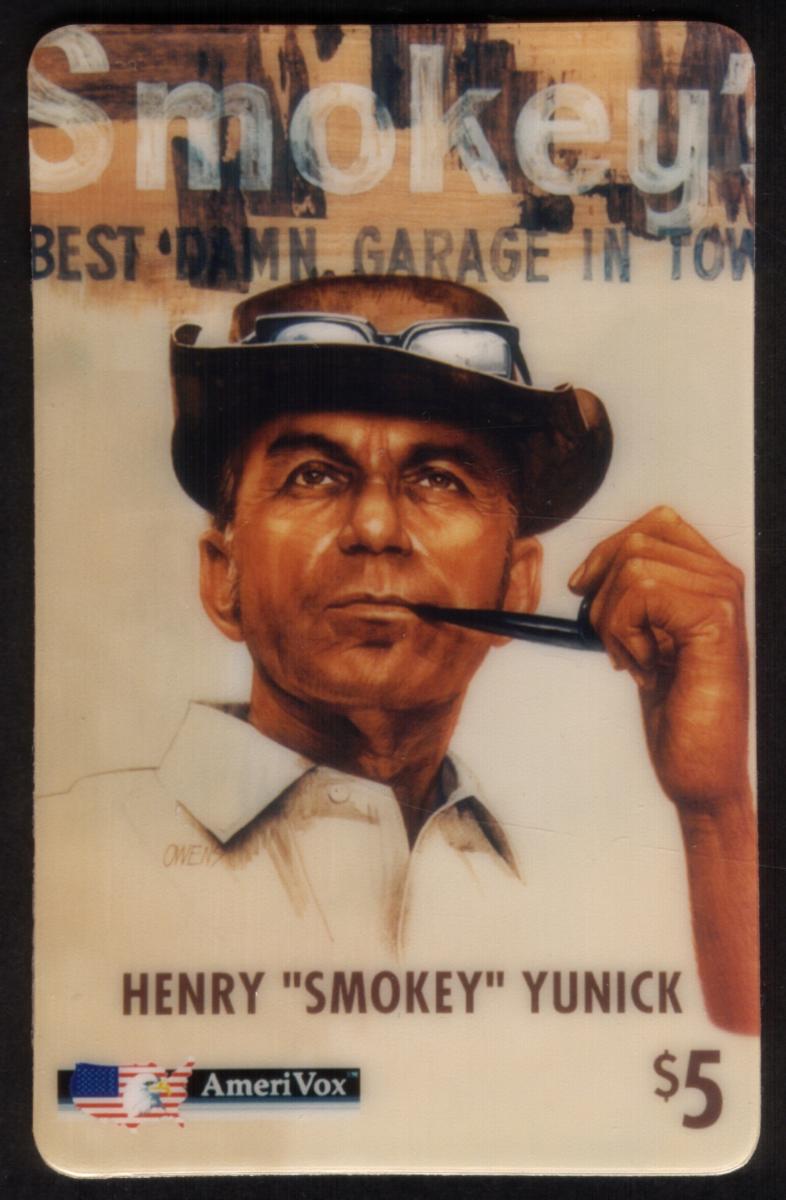 NASCAR legend Smokey Yunick portrait on a vintage-style phone card, featuring his iconic face, pipe, and Americana background, with $5 denomination. |