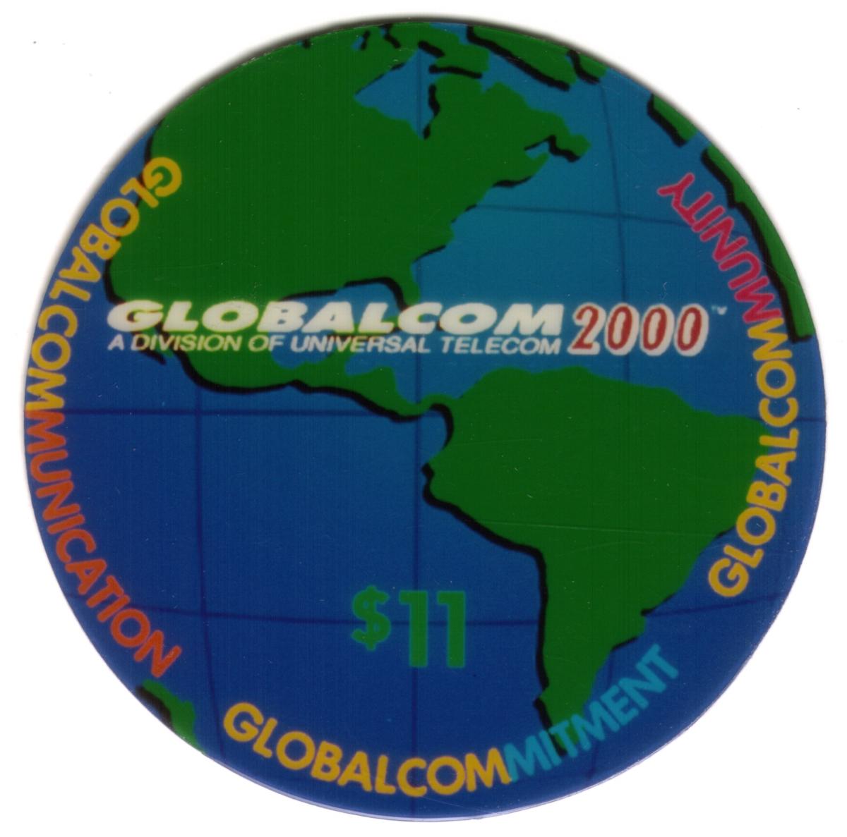 In the design, the card includes the phrases "Global Community," "Global Commitment," and "GlobalCom 2000," linking it specifically to the year 2000 and the concept of a connected world. The card’s value is clearly marked as "$11," indicating its denominational worth. The card also references "America’s Map," suggesting a regional or continental focus within the broader global theme.