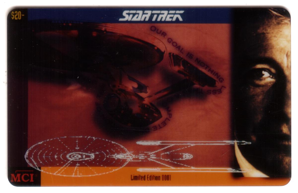The bottom left corner features the MCI logo in red, and the bottom center includes the text "Limited Edition 0001" indicating this card's collectible status. The value "$20" is printed in gold at the top left corner. The overall design blends space and character elements to highlight the iconic Captain Kirk and the Starship Enterprise from the Star Trek series.