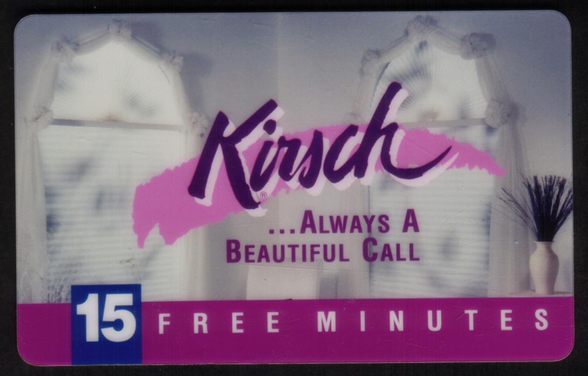 This collectible phone card features the brand name "Kirsch" prominently displayed in large, purple script with a pink brushstroke background. Below the brand name, the phrase "...Always A Beautiful Call" is printed in uppercase letters. The lower portion of the card has a magenta band with the number "15" set in white on a dark blue square, followed by the words "FREE MINUTES" in white uppercase letters, indicating the card offers 15 free minutes of phone usage.