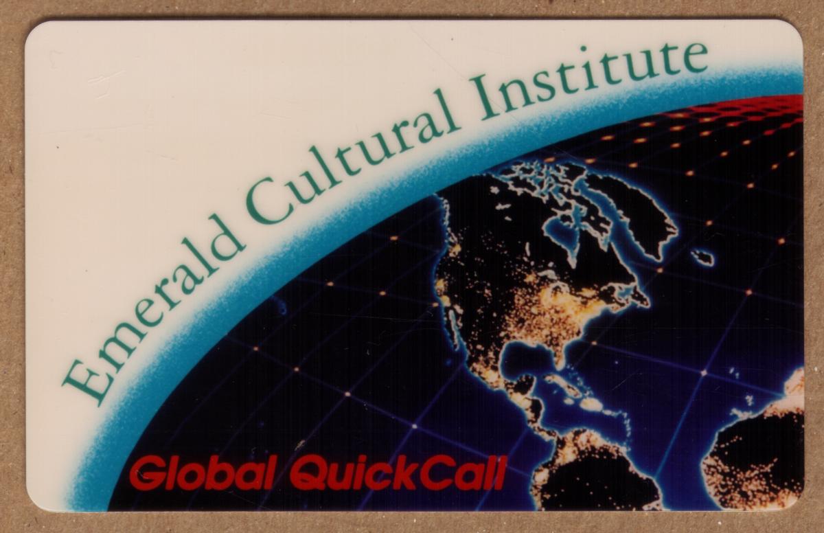 This collectible phone card features the name "Emerald Cultural Institute" prominently arched across the top left portion in green text. Below this, at the bottom left corner on a dark background, the words "Global QuickCall" appear in bold red letters. The card's design includes a dark blue and black globe highlighting North and Central America at night, with illuminated areas representing population centers or city lights. The globe is framed by grid lines running both vertically and horizontally, creating a network-like pattern across the planet. The edges of the globe fade into a smooth gradient of white, blending with the card's white background on the left side. The overall design conveys a theme of global communication and connectivity.