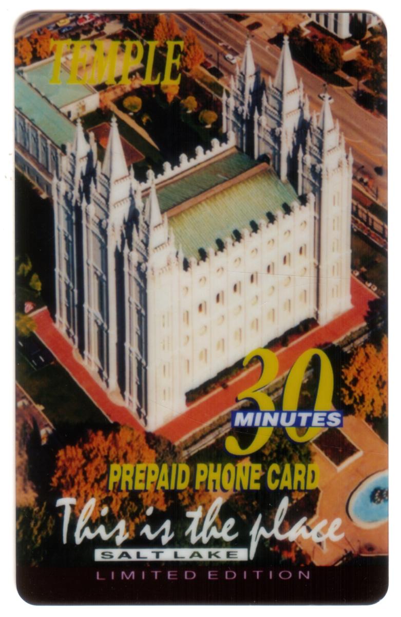 This collectible prepaid phone card features an aerial photograph of the Salt Lake City Temple, a significant religious building of The Church of Jesus Christ of Latter-day Saints (LDS Church). The temple, shown in bright daylight, stands prominently with its ornate spires and detailed architecture, surrounded by autumn-colored foliage and a water feature visible in the lower right corner. The card has the word "TEMPLE" printed in yellow at the top left, and the denomination "30 MINUTES" in bold yellow and blue lettering near the bottom right.