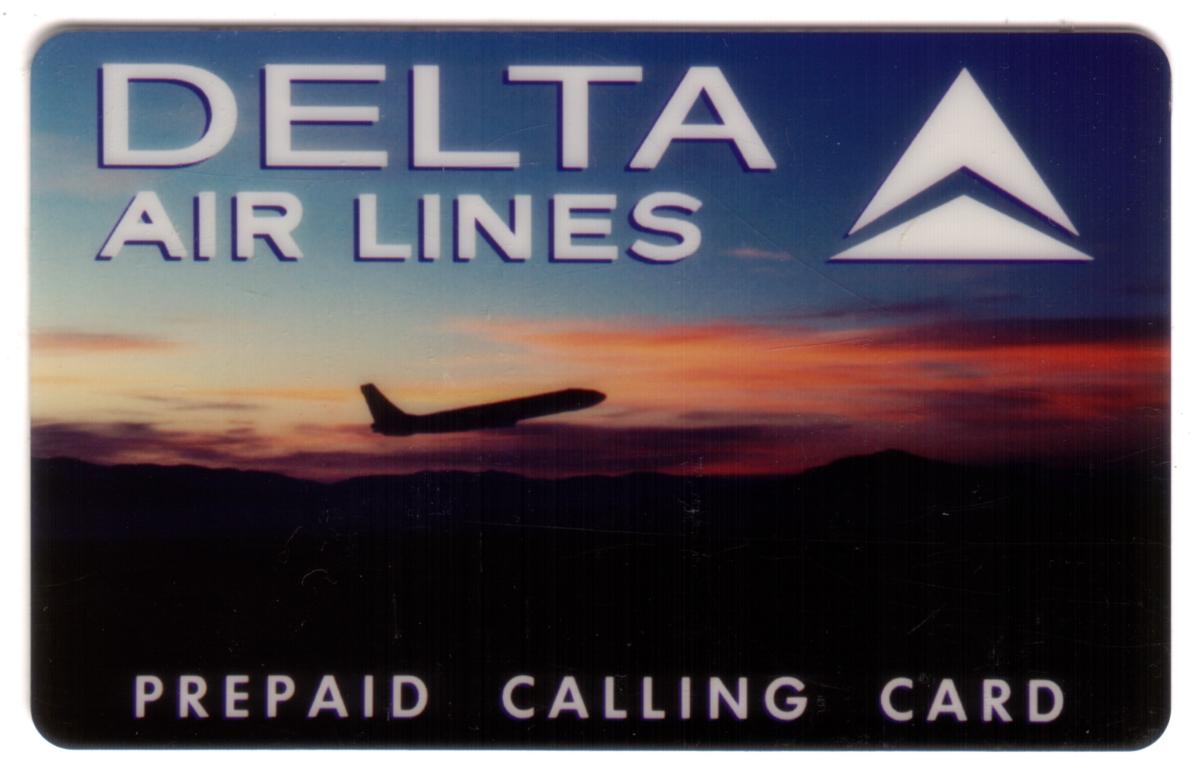 At the bottom of the card, the text "PREPAID CALLING CARD" is printed in clear, white uppercase letters, indicating its function. The overall design emphasizes the theme of aviation and travel with a dramatic and colorful sunset setting, reinforcing Delta Air Lines’ identity as a major airline company. The card serves as a promotional and functional telecommunications product associated with Delta Airlines and prepaid calling services.