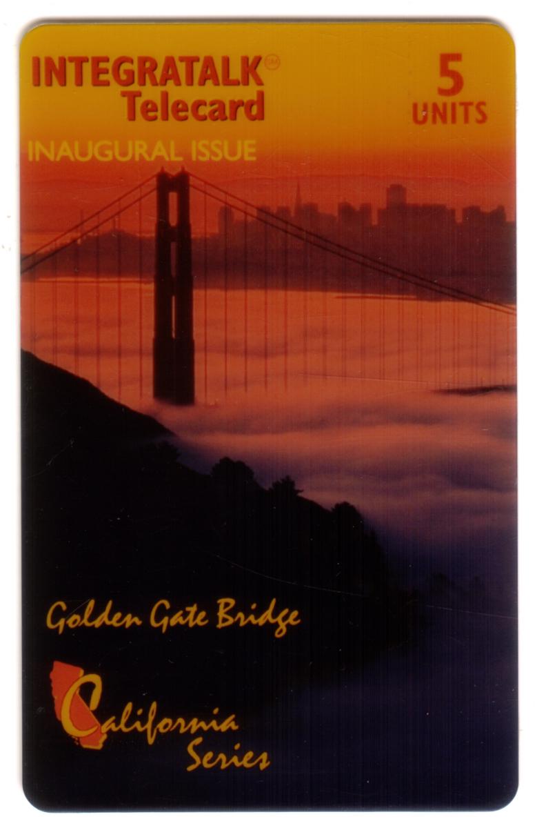 The card is labeled "INTEGRATALK Telecard" at the top left, with "5 UNITS" printed on the top right, indicating its usage value. Below "INTEGRATALK," the words "INAUGURAL ISSUE" appear in smaller text. At the bottom left of the card, the text "Golden Gate Bridge" is written in a yellow script font. Beneath that, "California Series" is displayed in the same yellow script, accompanied by a silhouette outline of the state of California filled in red.