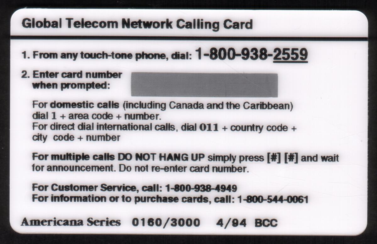 This card is a promotional user card associated with the Global Telecom Network. The imagery and text together highlight its intended use for international and domestic calls, while the artwork underscores American symbolism with the bald eagle as the central motif.