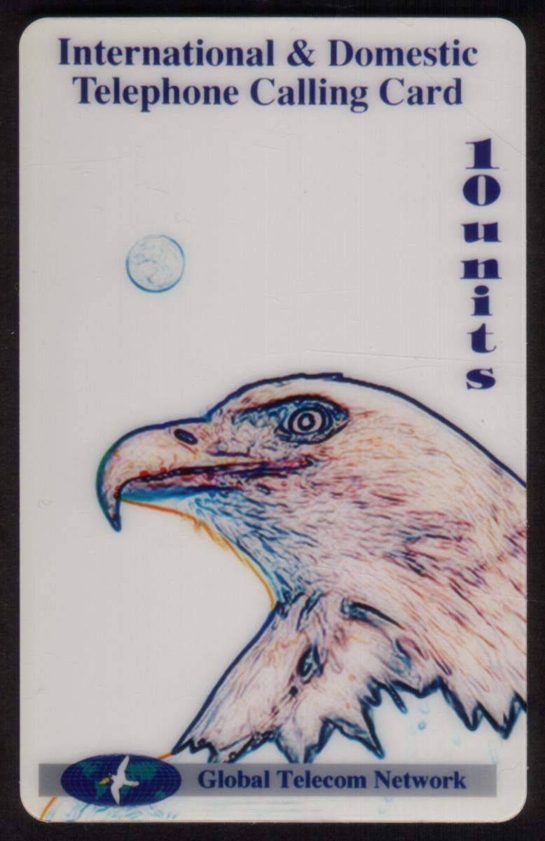 At the bottom, there is a blue rectangular logo containing a globe and a white silhouette of an eagle in flight, with the text "Global Telecom Network" beneath it. This identifies the telecommunications service provider associated with the card. The overall design uses a white background which highlights the patriotic theme centered on the bald eagle, a notable American symbol.