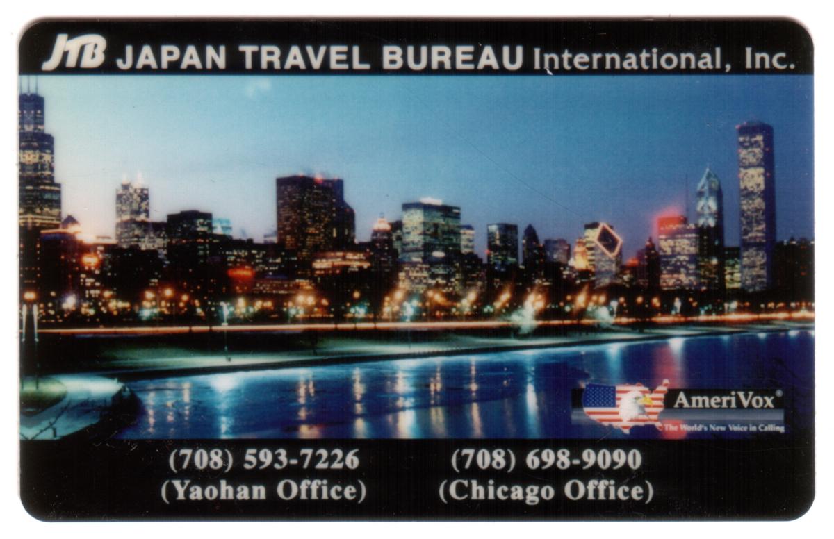 In the bottom right corner, the AmeriVox logo is displayed, including a small American flag and the slogan "The World's New Voice in Calling." This card is linked to promotional distribution through travel agencies, specifically Yaohan and JTB Japan Travel Bureau International, reinforcing its function as a communication product for travelers.
