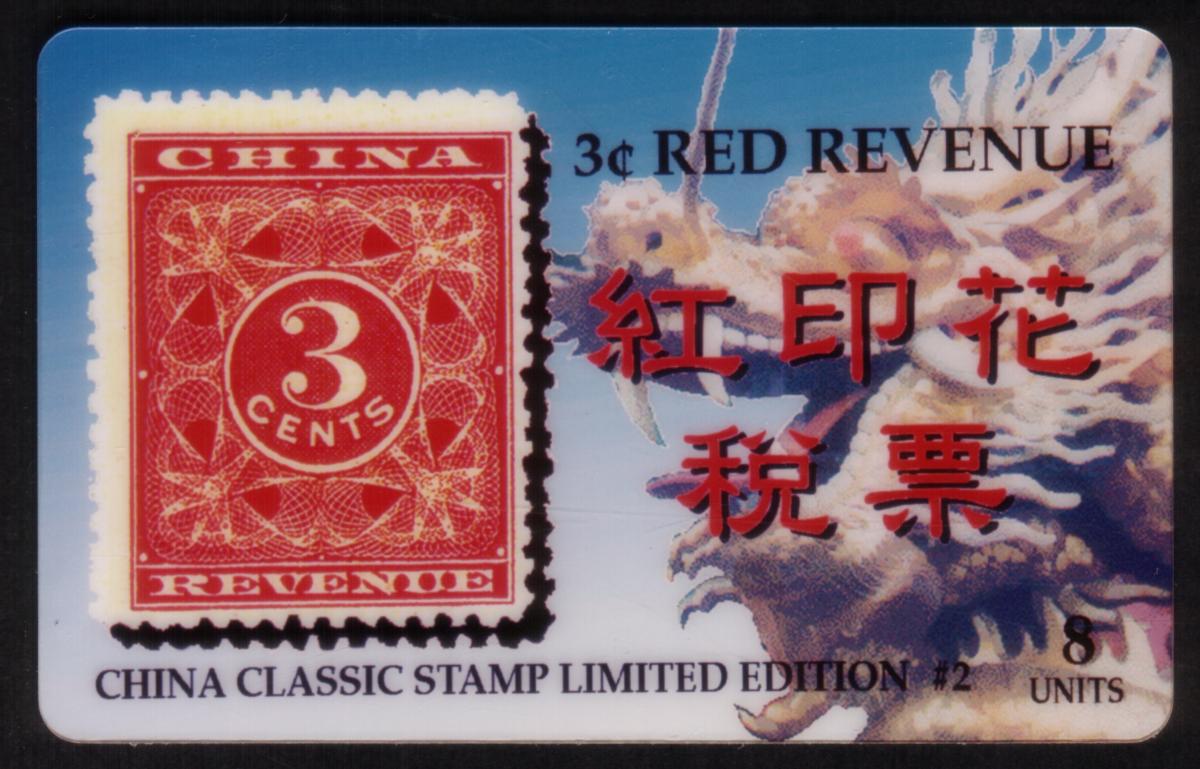 To the right of the stamp image, the text "3ยข RED REVENUE" appears in black capital letters above a set of four red Chinese characters. Below these characters and the main texts, the phrase "CHINA CLASSIC STAMP LIMITED EDITION #2" is printed in black, indicating the card is part of a specially released series. Additionally, the bottom right corner includes the notation "8 UNITS," identifying the card's unit value.