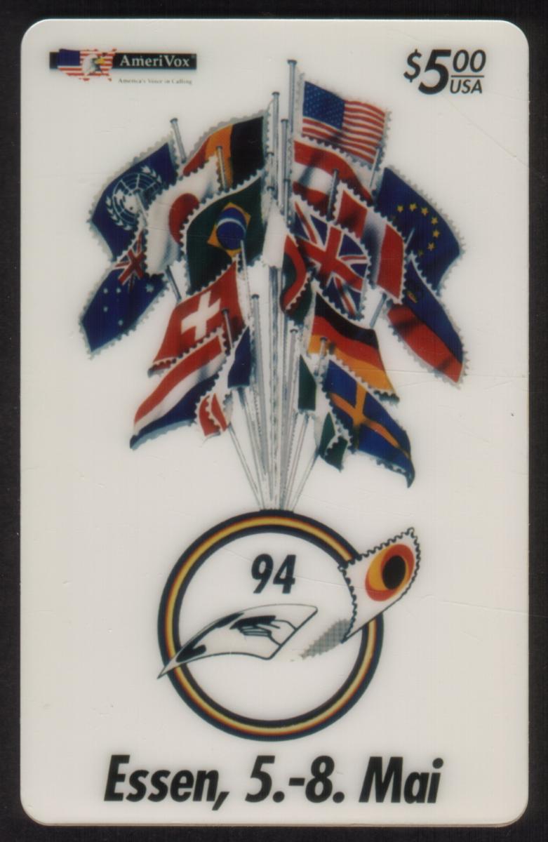 This collectible phone card commemorates the 1st International Phonecard Fair held in Essen, Germany, in May 1994. It prominently features multiple international flags, including several American flags, arranged in a vibrant display that symbolizes the global nature of the event. The card’s design includes the text "Telecard Events" and the date "05/94," directly referencing the timing and the theme of this gathering dedicated to phonecard collectors and enthusiasts.