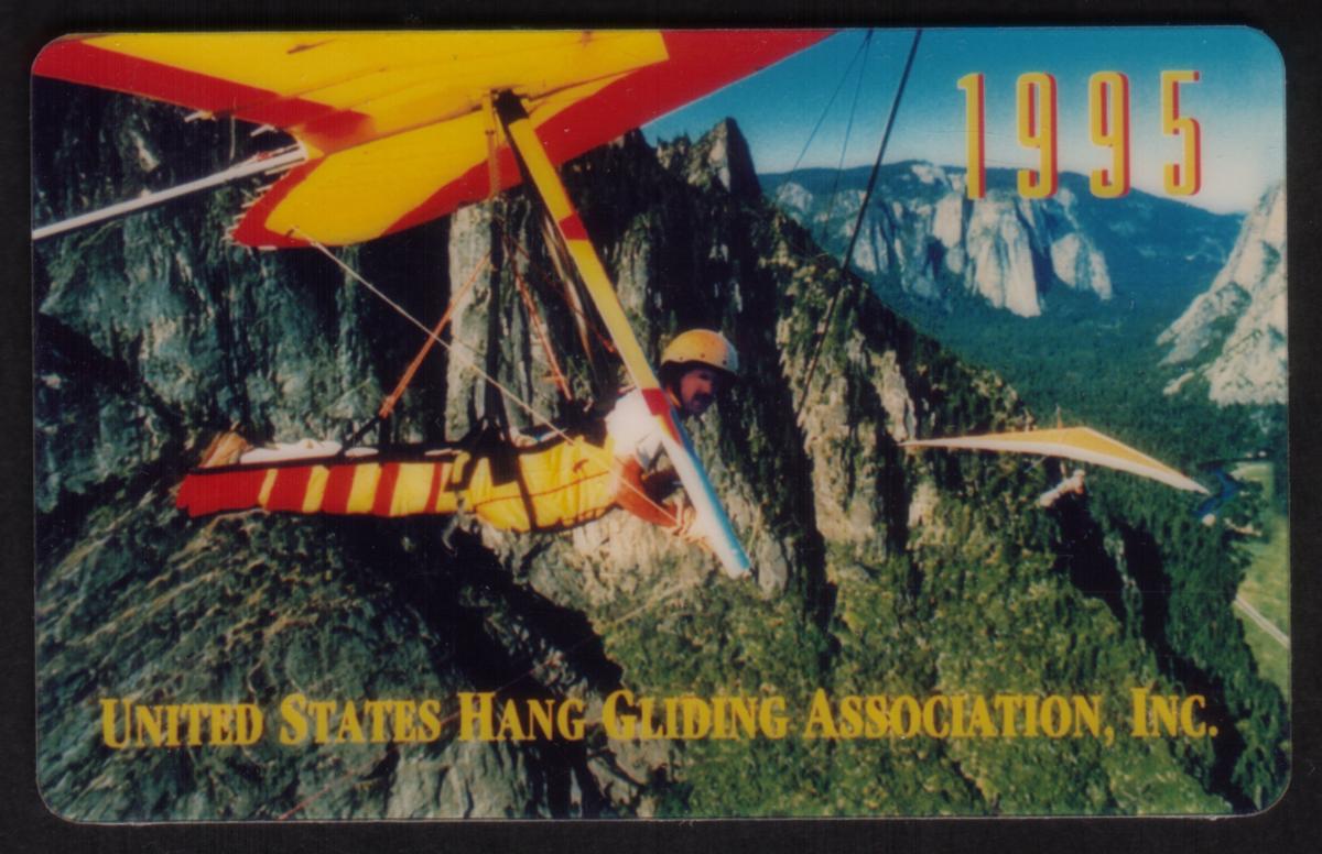 The card includes the text "1995" in large orange numbers at the top right corner. Along the bottom, it states "UNITED STATES HANG GLIDING ASSOCIATION, INC." in yellow capital letters. This card commemorates the sport of hang gliding and recognizes the role of the United States Hang Gliding Association in 1995.