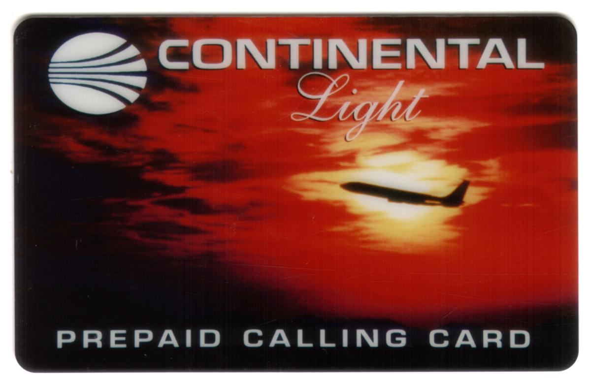 The overall design combines aviation themes with a warm color palette, highlighting Continental Airlines as the promotional subject of this phone card.