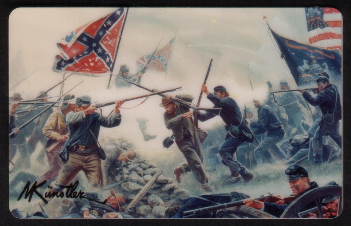 Signed by Kunstler, the painting is an evocative representation of Civil War battles, emphasizing themes of courage and combat. The card combines Americana, military history, and art, making it a sought-after collectible featuring important elements such as American and Confederate flags, weaponry, and soldiers in combat. The denomination printed on the card is $50. The card is issued by WorldCom.