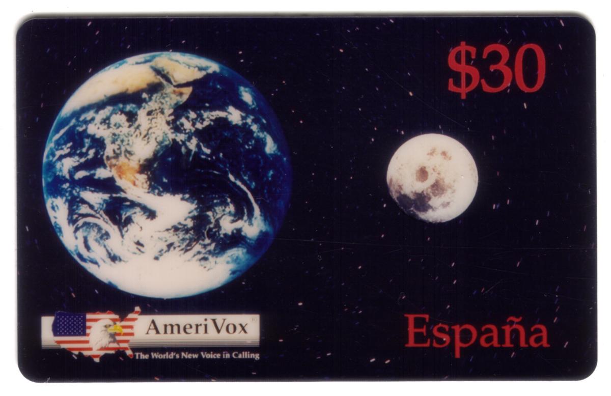 In the upper right corner, the value "$30" is printed in bold red font. Below the Moon and toward the lower right corner, the word "España" is displayed in matching red text. The lower left corner features a small American flag and an eagle emblem, accompanied by the text "AmeriVox" and the tagline "The World's New Voice in Calling." This indicates a connection to AmeriVox telecommunications.