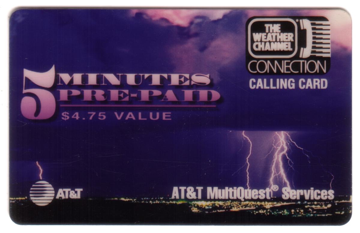 The card includes the prominent text "5 MINUTES PRE-PAID" in large, metallic-looking font with a pinkish hue, accompanied by "$4.75 VALUE" beneath it. The upper right corner displays the logo for THE WEATHER CHANNEL CONNECTION along with the words "CALLING CARD." The bottom left corner features the classic AT&T globe logo.