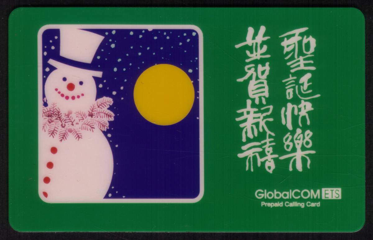 The card's background is green, and to the right of the snowman image, there are Chinese characters written in white, which translate to "Merry Christmas and Happy New Year." Below the characters is the GlobalCOM ETS logo alongside the text "Prepaid Calling Card," confirming its use as a prepaid phone card.