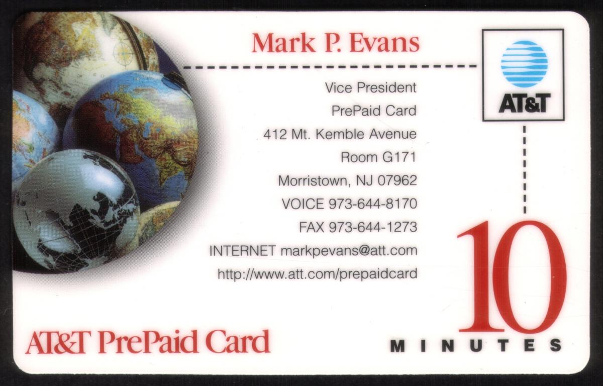 This AT&T prepaid calling card is promotional and clearly associated with Mark P. Evans, the Vice President of their PrePaid Card Division. The design combines corporate identification with a global earth theme and branding elements from AT&T.