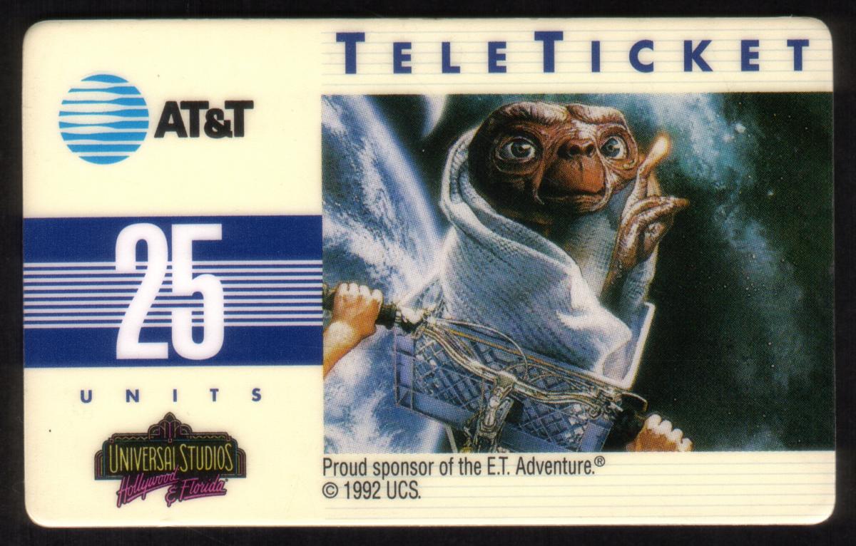 E.T. the Extra-Terrestrial themed phone card featuring E.T. with glowing finger, bicycle, and cosmic background, linked to Universal Studios and 25 prepaid minutes. |