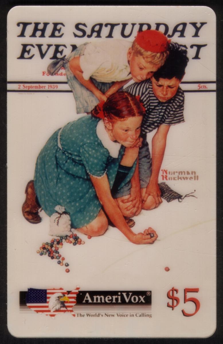 This piece merges Americana, artistic heritage, and nostalgic imagery, highlighting themes of childhood play and competition. It serves as a collectible phone card honoring Norman Rockwell’s iconic style and the cultural impact of The Saturday Evening Post during the mid-20th century. The detailed and vivid depiction of children playing marbles creates an inviting and memorable scene rooted in traditional American art.