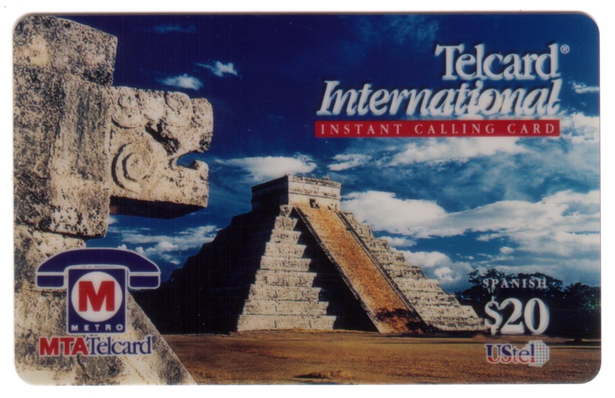 This card is a $20 Metro MTA Telcard International calling card issued by USTel. It integrates cultural heritage imagery with telecommunications branding, suitable for collectors interested in phone cards featuring global landmarks and architecture from the Yucatan region.