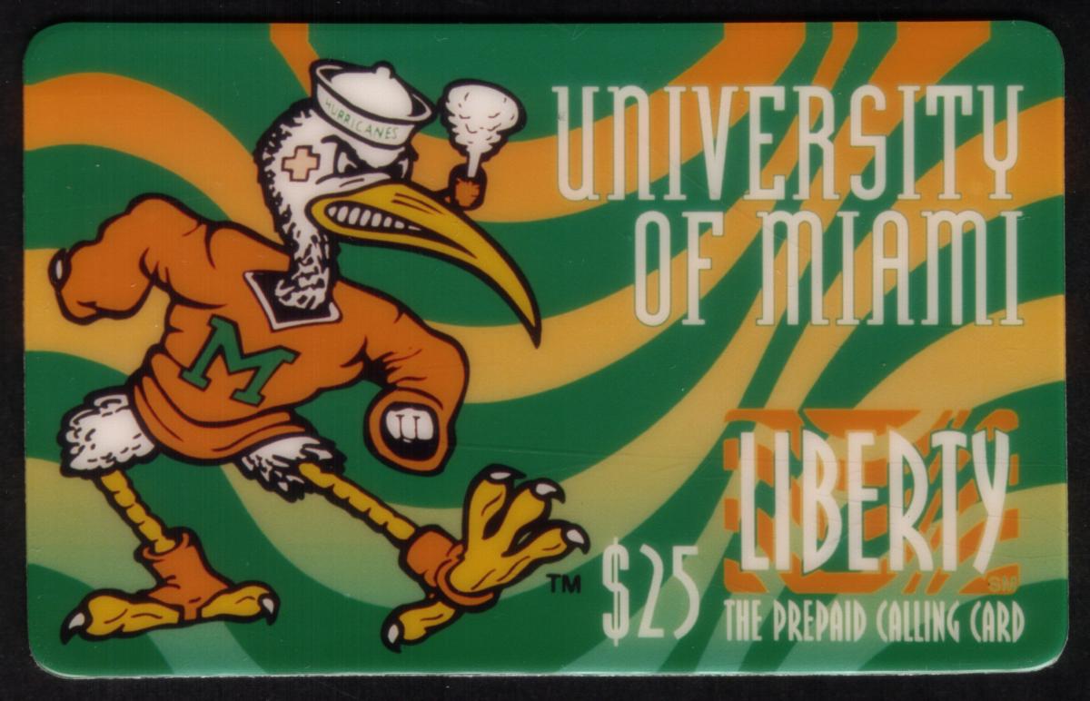 Text on the card includes "UNIVERSITY OF MIAMI" in large, vertical white letters on the right side, along with "$25" and "LIBERTY" in a bold, stylized font. Below that, "THE PREPAID CALLING CARD" is written in smaller white text. This card was issued by Liberty and is designed for calling purposes with a $25 value.