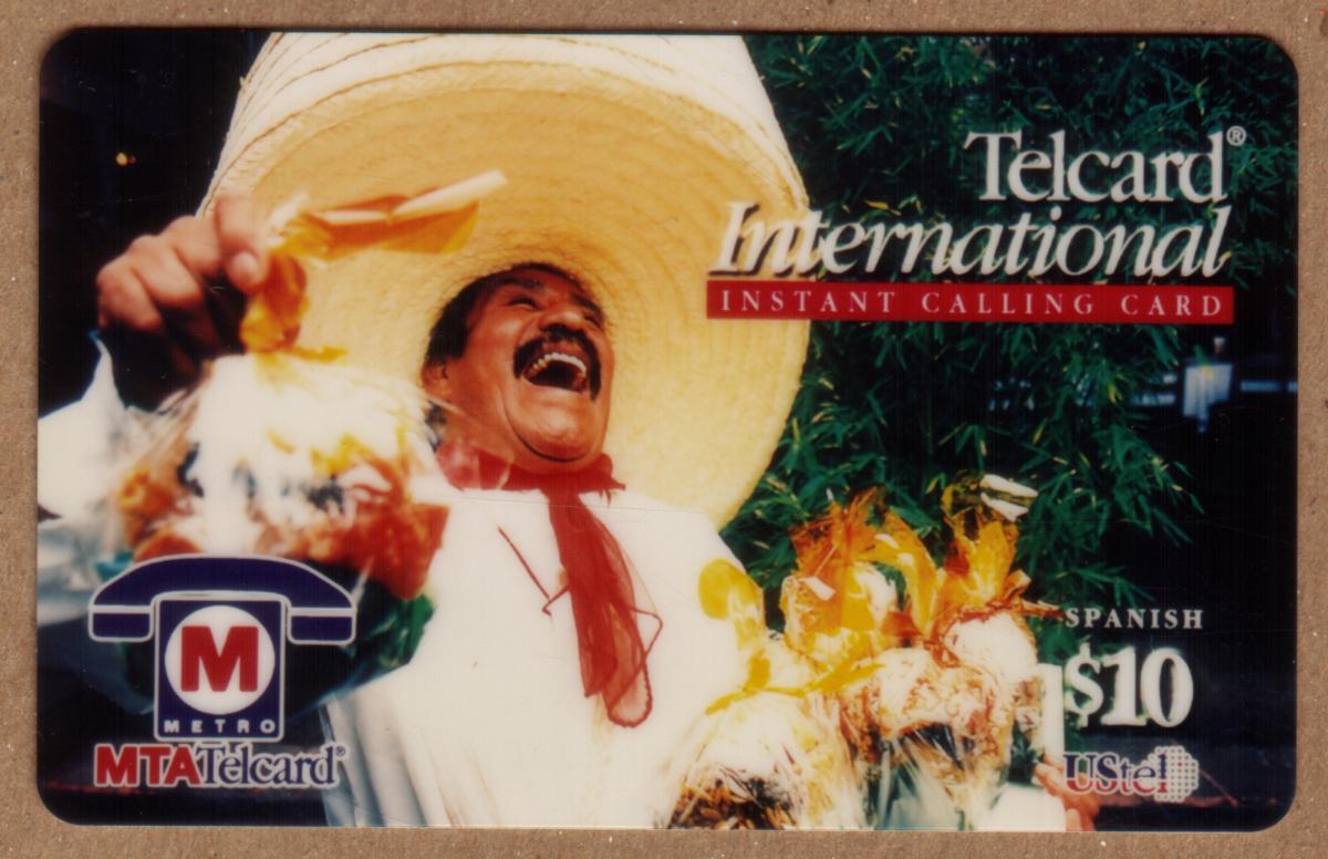 This collectible phone card is a Metro MTA Telcard International Instant Calling Card with a $10 value, identified as part of the US Tel (USTel) series. The card features a vibrant photographic image of a man in traditional Mexican attire, wearing a large sombrero hat and a red neckerchief, joyfully holding up what appear to be decorated Mexican dance props wrapped with yellow ribbons. The man’s expression captures a lively moment connected to Mexican cultural dance.