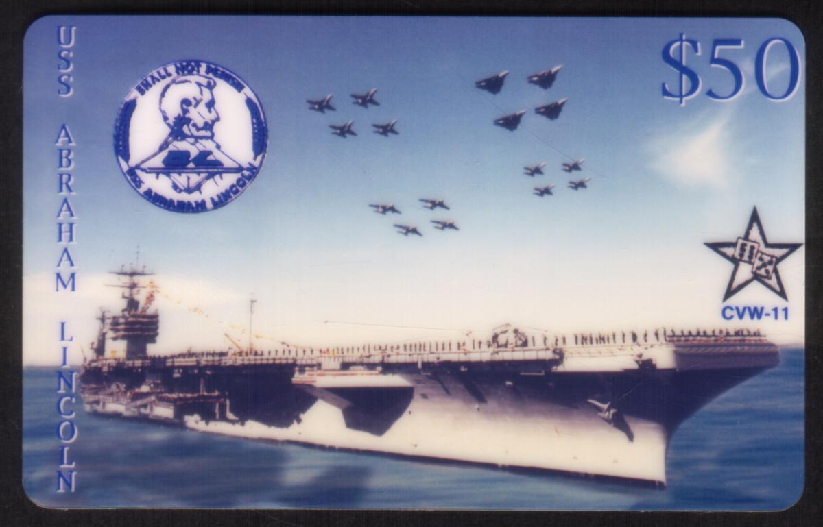 This collectible phone card features a detailed image of the USS Abraham Lincoln, a nuclear-powered Nimitz-class aircraft carrier of the United States Navy. The image shows the carrier at sea under a clear sky, highlighting its large flight deck with jets parked and personnel visible along the edge. Above the ship, multiple military aircraft are flying in formation, emphasizing the carrier’s role as a central hub for naval air operations.