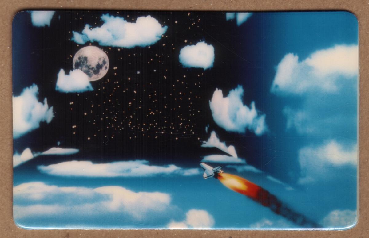 The card’s artistic style combines realism with a slightly surreal atmosphere, shown by the blending of space elements and clouds, creating an impression of the shuttle traveling from Earth’s atmosphere into outer space. The shuttle is small in scale compared to the expansive sky, moon, and stars, giving a sense of vast distance and the grandeur of the Moon mission.
