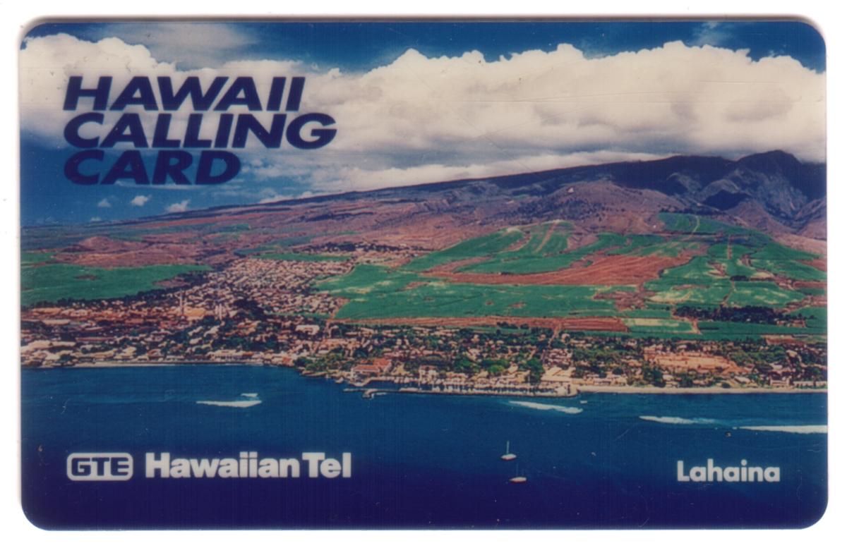 This collectible phone card features an aerial photograph of Lahaina, a town located on the island of Maui, Hawaii. The image vividly captures the coastline, with water in the foreground and a scenic view of the town’s layout against a backdrop of green hills and mountains. The sky above is partly cloudy, creating a dynamic and natural atmosphere over the landscape.