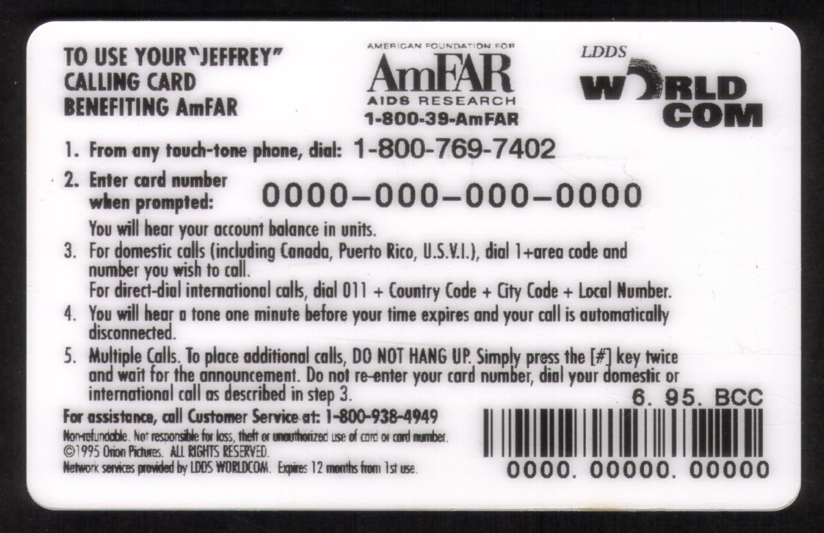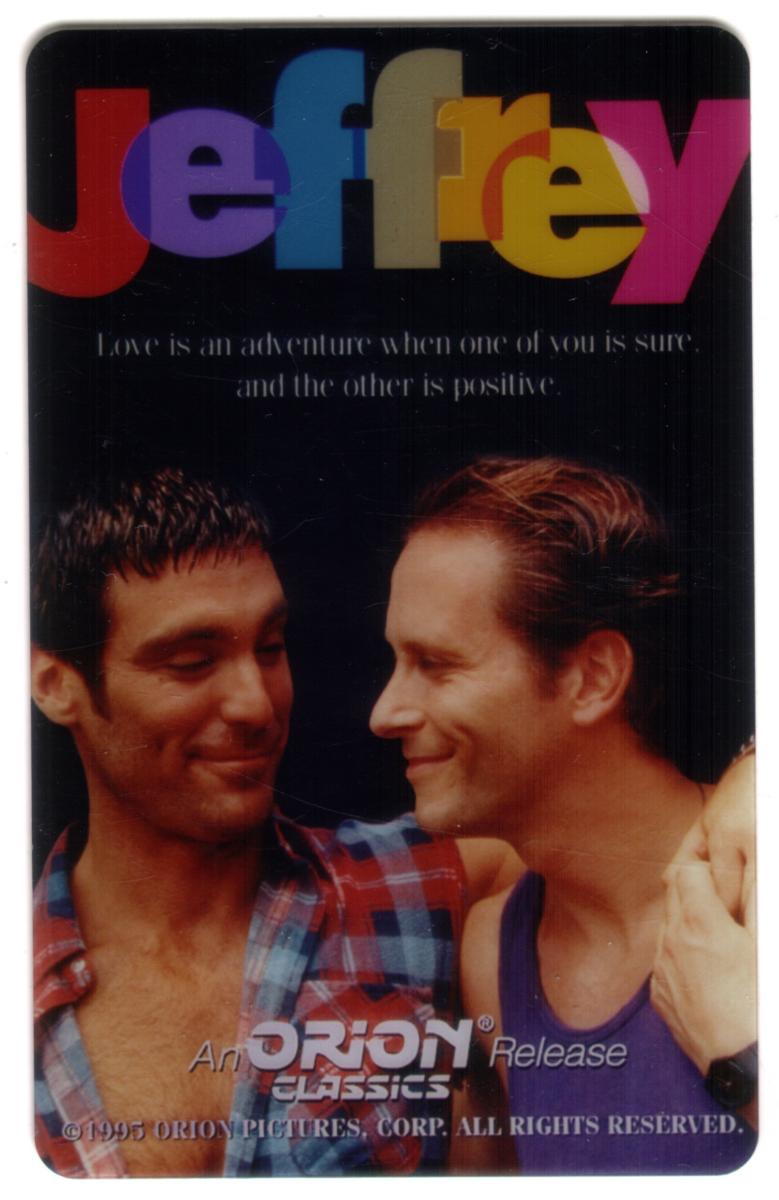 This card is related to the 1995 romantic comedy film "Jeffrey," which centers on gay themes and is associated with LGBTQ entertainment. The keywords include "amfar aids research," linking this collectible to amfAR, an organization focused on AIDS research. Additional mentions include "Hollywood film," "lgbt," "glbt," "lgbtq," and "Prototype," emphasizing its cultural and entertainment context. The card references "amFAR 1995 Orion - LDDS WorldCom" connected to the production and distribution of the film.