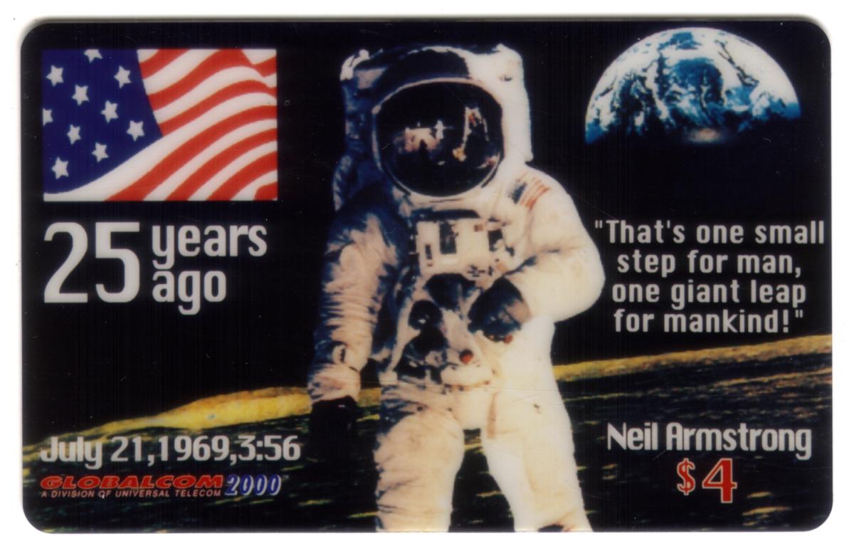 This collectible phone card commemorates the 25th anniversary of the moon landing on July 21, 1969, at 3:56 AM. The card features an image of NASA astronaut Neil Armstrong standing on the lunar surface in his spacesuit. In the background, Earth is visible rising over the moon’s horizon.