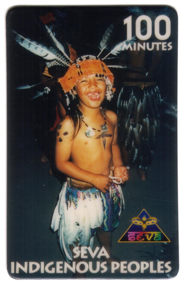 The card has the text "100 MINUTES" in the top right corner, indicating the phone card’s usage duration. At the bottom, the text reads "SEVA INDIGENOUS PEOPLES" in white, bold letters. Next to this text is the colorful logo of the Seva Foundation, which includes the name "Seva" in multicolored letters beneath a yellow and blue design.
