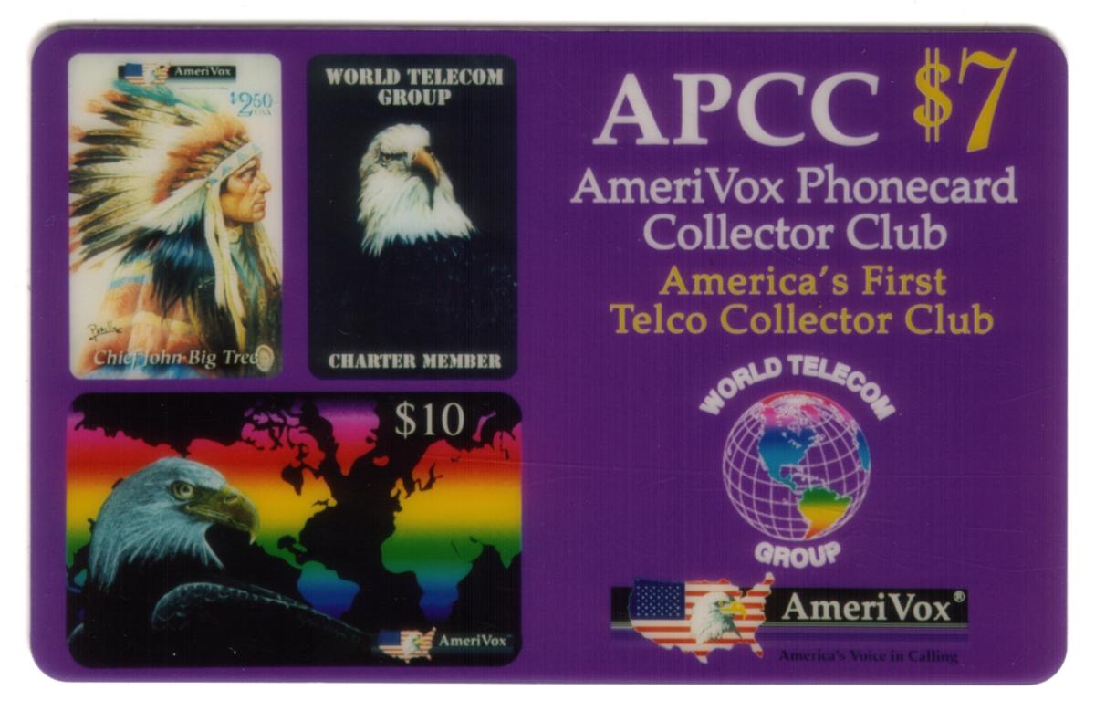 On the right side, large white and yellow text reads, "APCC $7 AmeriVox Phonecard Collector Club," along with the tagline "America’s First Telco Collector Club." Below this text is a globe showing continents in purple lines and the text "WORLD TELECOM GROUP" encircling it. At the bottom right corner is a stylized American map featuring the U.S. flag and the AmeriVox logo with the phrase "America’s Voice in Calling."