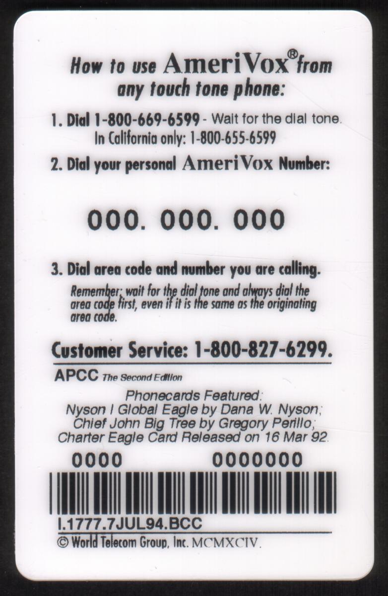 This card highlights themes of Native Americans and bald eagles, combining imagery of wildlife and cultural heritage with telecommunications branding specific to AmeriVox and the AmeriVox Phonecard Collector Club. The denominations $7 and $10 indicate its collectible nature, connected to World Telecom Group membership and phone card collecting history.