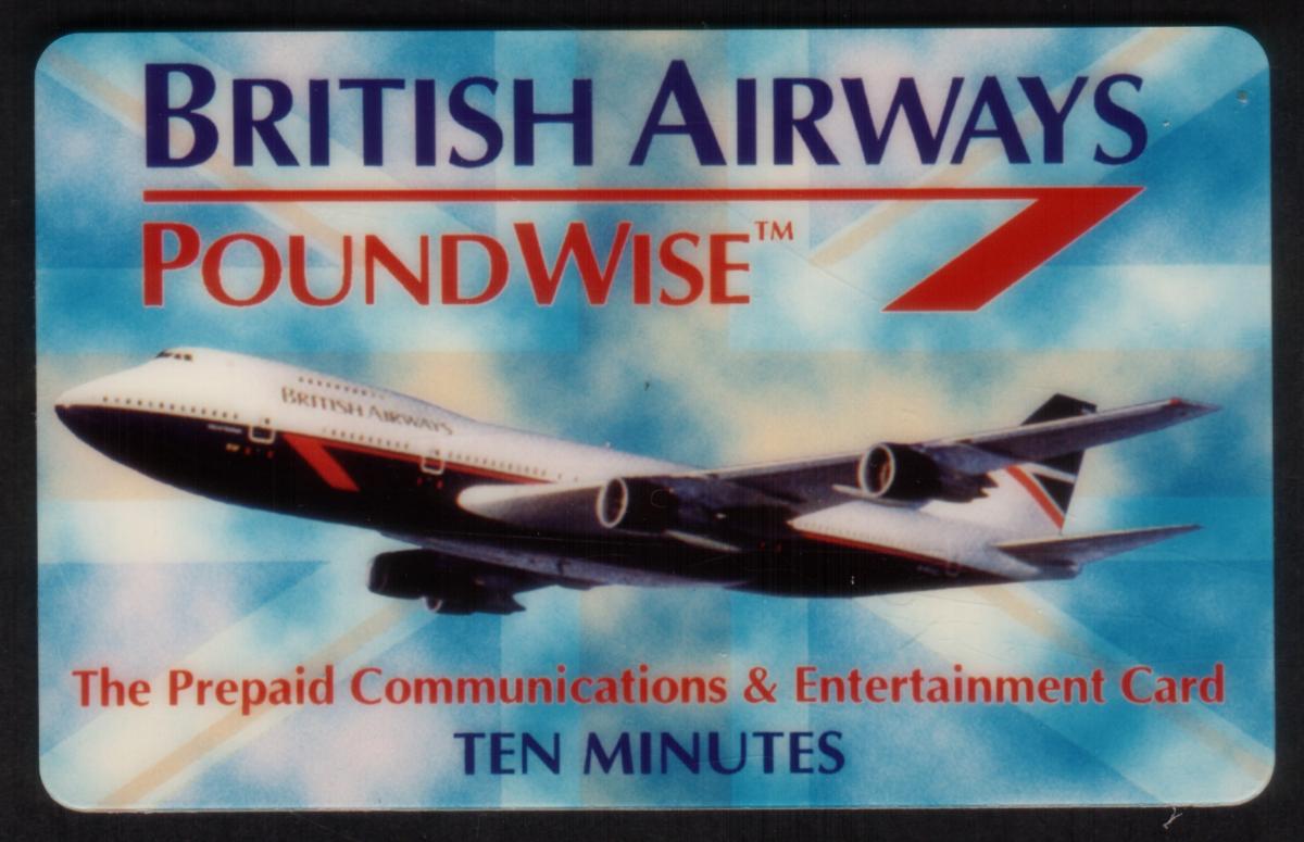 Beneath the airplane image, the card text reads, "The Prepaid Communications & Entertainment Card," indicating its use for prepaid services. At the bottom center, the card specifies "TEN MINUTES," denoting the stored value or usage time available. This card includes a magnetic stripe and smart card technology, designed for use in the USA and UK. The combination of British Airways branding and the PoundWise name clearly identifies it as a prepaid communication card related to travel and transportation.