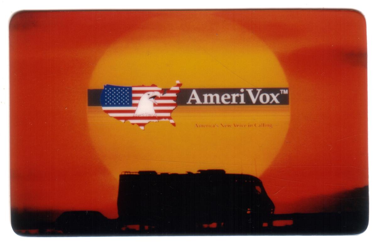 The AmeriVox logo is positioned toward the upper center of the card. It includes a stylized map of the United States filled with the American flag design, featuring stars and stripes in red, white, and blue. Overlaid on this map is a white eagle's head, symbolizing American imagery. Next to the map, the brand name "AmeriVox™" is printed in white text on a dark horizontal banner. Beneath the banner, the slogan "America’s New Sense in Calling" appears in smaller, lighter text.