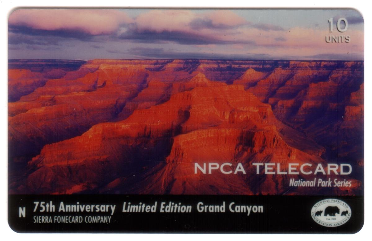The card is part of the National Park Series issued by the Sierra Fonecard Company. It commemorates the 75th anniversary of the National Parks & Conservation Association (NPCA), reflecting its dedication to nature conservation. The design is labeled as a Limited Edition Grand Canyon phone card, highlighting its collectible status.