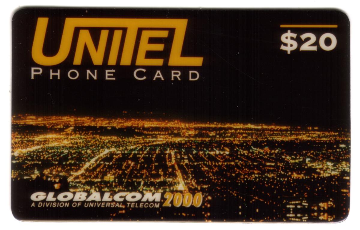 The card includes printed text indicating its association with Unitel, Universal Telecom, USTel, and US Tel, prominent telecommunications companies. The denomination of the card is $20, referencing its value for telecommunications purposes. Additional markings show the terms "Globalcom 2000" and "Los Angeles At Night USED," further identifying the card’s theme and origin.