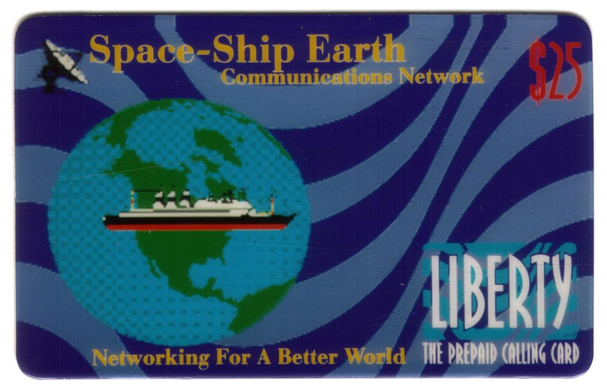 Text on the card is printed in yellow and white. At the top, it reads "Space-Ship Earth Communications Network." Near the bottom, in yellow text, it states "Networking For A Better World." On the right side in bold white letters, the word "LIBERTY" appears vertically, followed by smaller text stating "THE PREPAID CALLING CARD." A red $25 denomination is shown in the top right corner.