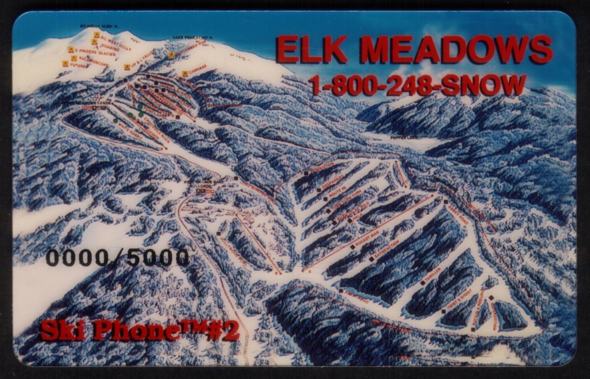 The card combines artistic and functional elements to serve as both a collectible and an informational piece regarding the Elk Meadows ski terrain. The use of red text contrasts strongly against the snowy background, making the key details easily visible.