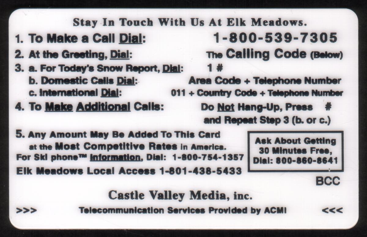 This collectible phone card features a detailed illustrated trail map of the Elk Meadows Snow Ski Resort Area in Southern Utah. The map prominently displays multiple ski runs, lift lines, and topographical details of the mountainous terrain. The illustration is rendered in shades of blue and white, emphasizing the snow-covered landscape and elevation changes.