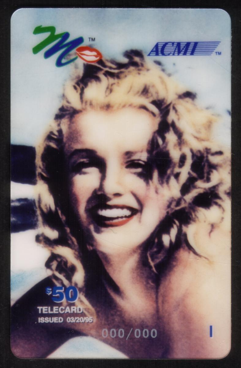 This collectible phone card features a photographic image of Marilyn Monroe smiling with her head slightly tilted back, showcasing her iconic blonde curls and red lipstick. The image is a close-up portrait from shoulder to head. The card has prominent markings including a colorful “mo” logo in the top left and a blue “ACMI” logo in the top right.